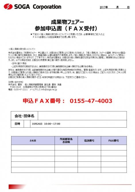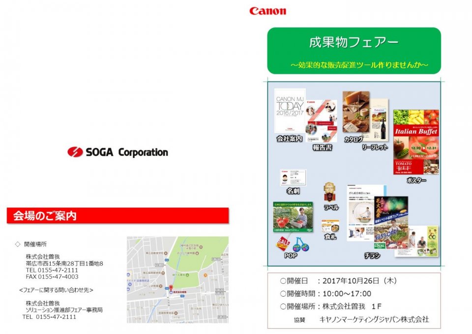 平素はご愛顧を賜り、誠にありがとうございます。 さて、この度は「成果物&セキュリティフェアー」のご案内を申し上げます。 効果的な販売促進ツール作りを体感しませんか? 詳しくは下記パンフレットをご覧ください。 皆様のご来場心よりお待ち申し上げます。 日時 2018年5月23日(水)24日(木) 10:00~17:00 会場 株式会社 曽我1F 多目的ルーム・3F 会議室帯広市15条南28丁目1番地8号