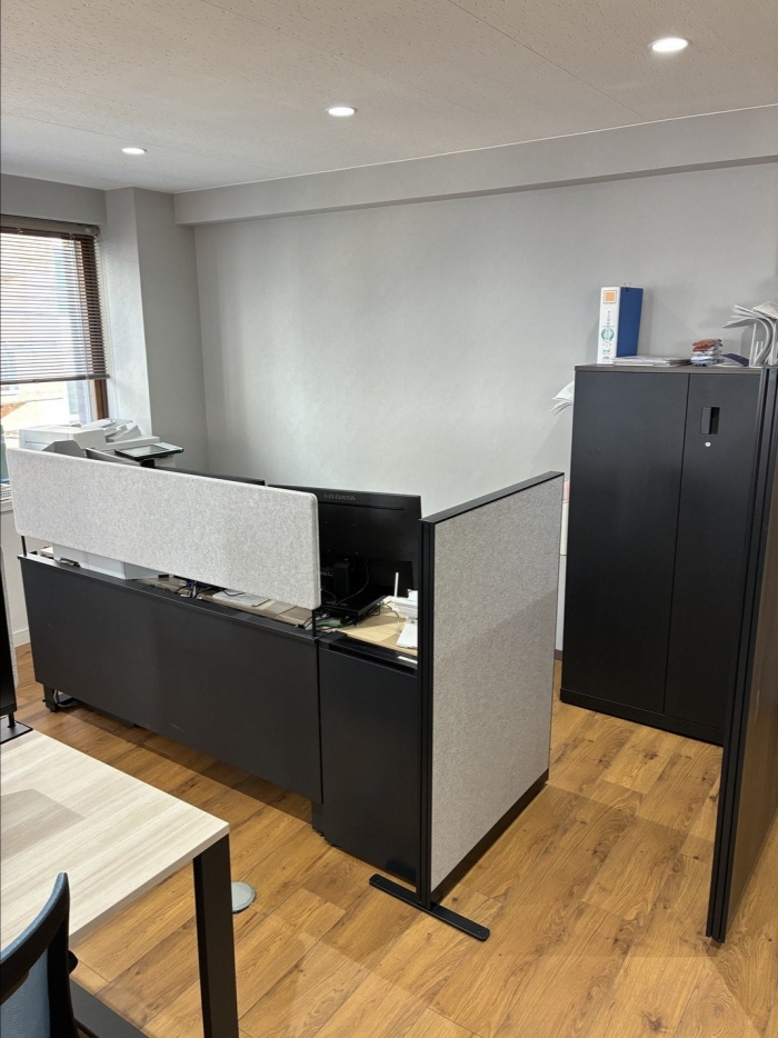 備品関連は落ち着きのある「ブラック」を選定し、床も木目のフロアシートのためオシャレな感じです。